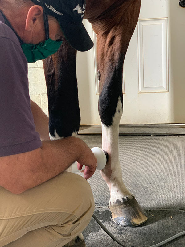 Shockwave therapy is portable and can be performed at the clinic or on the farm. It is typically well-tolerated by horses, though the treatment itself can be uncomfortable. Horses generally require light sedation and occasionally earplugs.